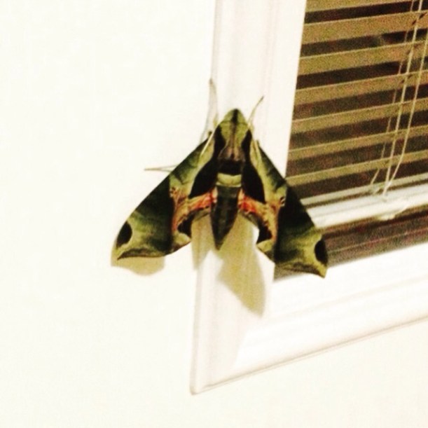 I love butterflies!!! But this moth flew in my front door tonight, attacked me, and scared me half to death!! I literally thought it was a hummingbird! It’s really that big! Peaches hid under the table..probably a combination of the moth flying around and my screams! I finally got a Tupperware bowl and trapped it and let it go outside. Whew! It was pretty though…if it had stayed outside π I googled it after I let it go and found out I’m not the only one who has confused it with a bird before! http://www.insectidentification.org/insect-description.asp?identification=Pandorus-Sphinx-Moth